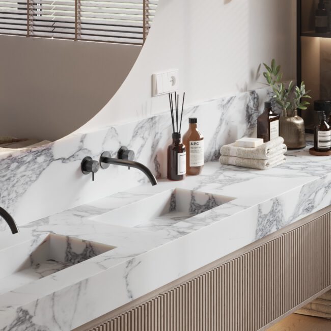 Hier entsteht ein Badezimmer, der keine Wünsche offenlässt. Ein anspruchsvolles und zeitloses Design, sorgfältig ausgewählte Materialien und bauliche Qualität treffen hier zus
